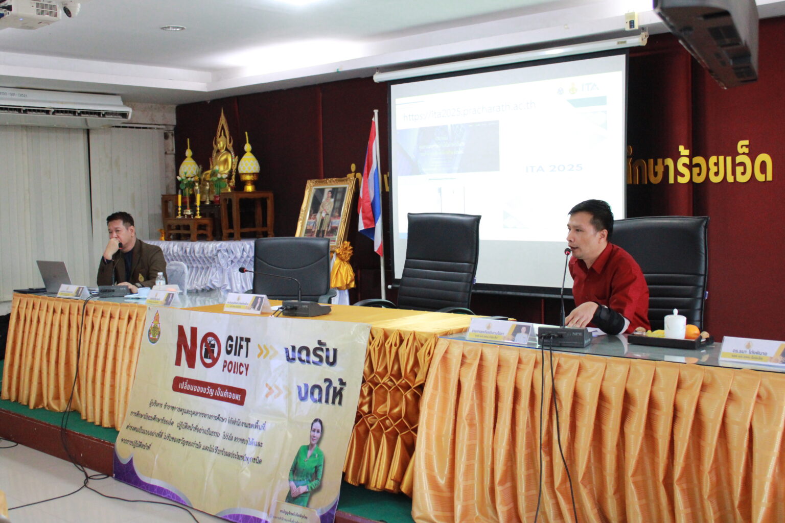 วันที่ 22 เมษายน 2568 ดร.ธัญญลักษณ์ เกียรติกุลไทย ผู้อำนวยการสำนักงานเขตพื้นที่การศึกษามัธยมศึกษาร้อยเอ็ด มอบหมายให้ นายเทอดเกียรติ ยามโสภา รองผู้อำนวยการสำนักงานเขตพื้นที่การศึกษมัธยมศึกษาร้อยเอ็ด เป็นประธานในการประชุมจัดเตรียมข้อมูล หลักฐาน เอกสารตามแบบวัดการเปิดเผยข้อมูลสาธารณะ (Open Data Integrity and Transparency Assessment : OIT) การประเมินคุณธรรม และความโปร่งใส ในการดำเนินงานของสำนักงานเขตพื้นที่การศึกษาออนไลน์ (ITA Online) ประจำปีงบประมาณ 2568 และร่วมถอดบทเรียนผลการประเมินคุณธรรมและความโปร่งใสในการดำเนินงานของสำนักงานเขตพื้นที่การศึกษา ในปีงบประมาณ พ.ศ.2567 ที่ผ่านมา พร้อมมอบนโยบายให้ ผู้อำนวยการกลุ่ม/หน่วย และบุคลากรทางการศึกษาในสังกัด งดรับ งดให้ของขวัญและของกำนัลทุกชนิดจากการปฏิบัติหน้าที่ ในการประชุมบุคลากรสำนักงานเขตพื้นที่การศึกษาร้อยเอ็ด เพื่อเตรียมความพร้อมรับการประเมินคุณธรรม และความโปร่งใสในการดำเนินงานของสำนักงานเขตพื้นที่การศึกษาออนไลน์ ITA Online ประจำปีงบประมาณ พ.ศ.2568 ณ ห้องประชุมอินทนิล สำนักงานเขตพื้นที่การศึกษามัธยมศึกษาร้อยเอ็ด